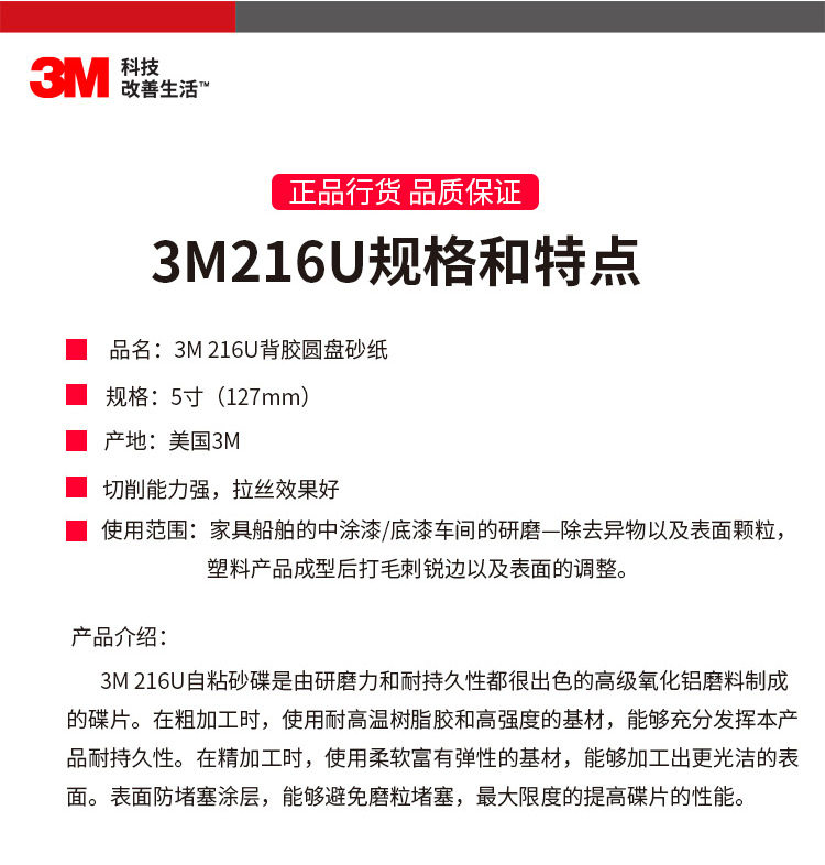 ●3M 216U自粘砂碟是由研磨力和耐持久性都很出色的氧化铝磨料制成的碟片;