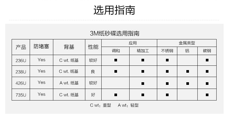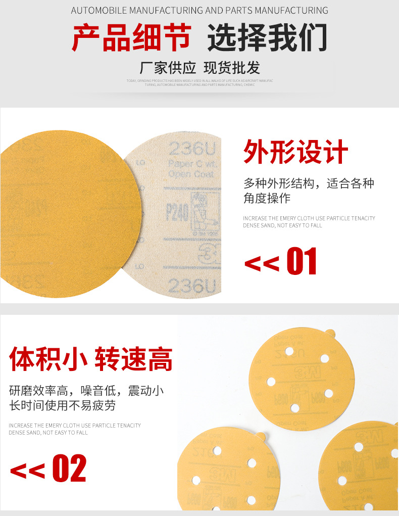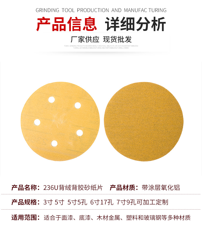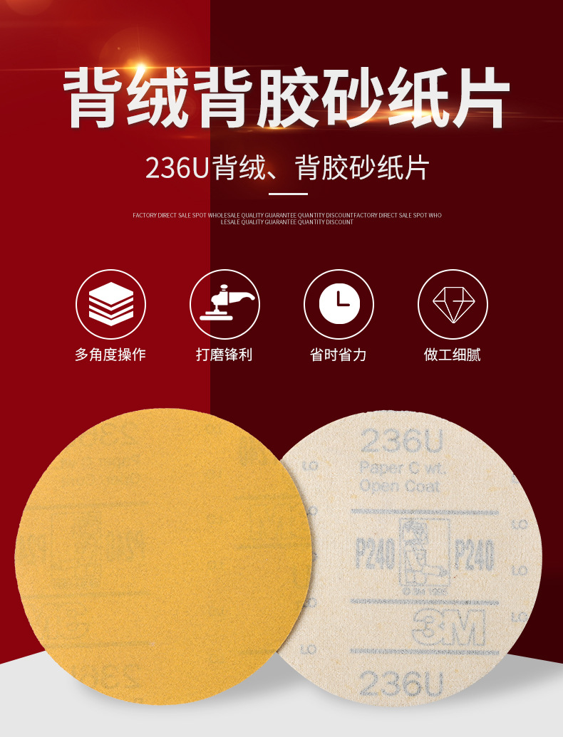 ●3M 236U/216U背胶绒砂纸片,产品使用精密饰选之优质氧化铝研磨材切削强,寿命特久,大大提高生产力,背基经特别加厚,使用时不易被工件撕破,为不规则表面之粗磨工序而设计。砂粒经精密挑选,砂纸采用静电植方式,使砂粒尖刀朝外,切削锋利,植砂均匀,效果比其它产品更划一,不致留下不均匀的砂痕砂纸无积屑及脱落现象,切削力更强纸质经特别防滑处理,软硬适中,表现更胜一筹砂纸表面的防堵塞涂层,加强矿砂附着力,不易堵塞或脱落,寿命更长边角涂层减少底漆或尘土积存;