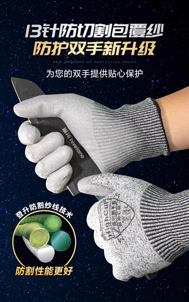 采用十三针防切割包覆纱工艺,防割性能更好;