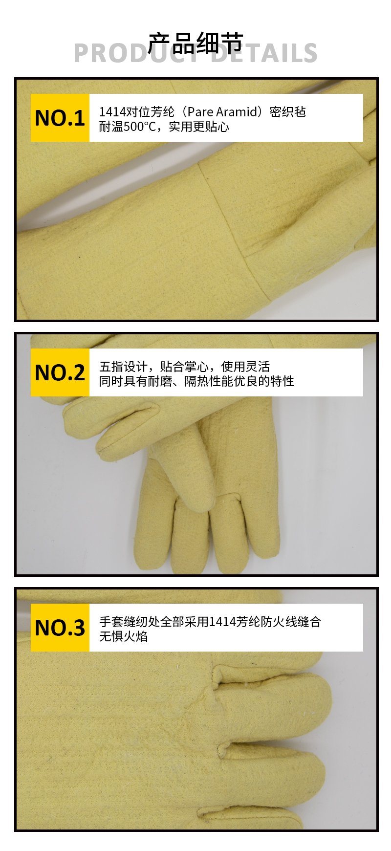 3.推荐用途:玻璃、水泥、陶瓷等行业窑炉高温抢修时工作人员的手部防护;