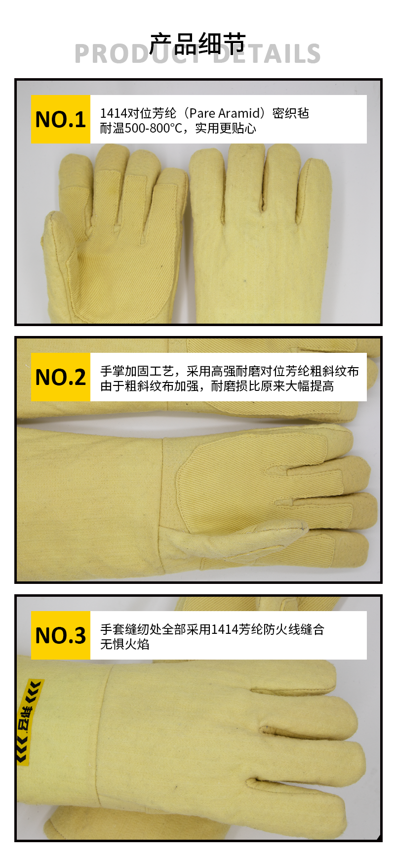 4.产品特点:采用手掌加固工艺,加固部位为高强耐磨对位芳纶粗斜纹布,由于粗斜纹布加强,耐磨损比原来大幅提高