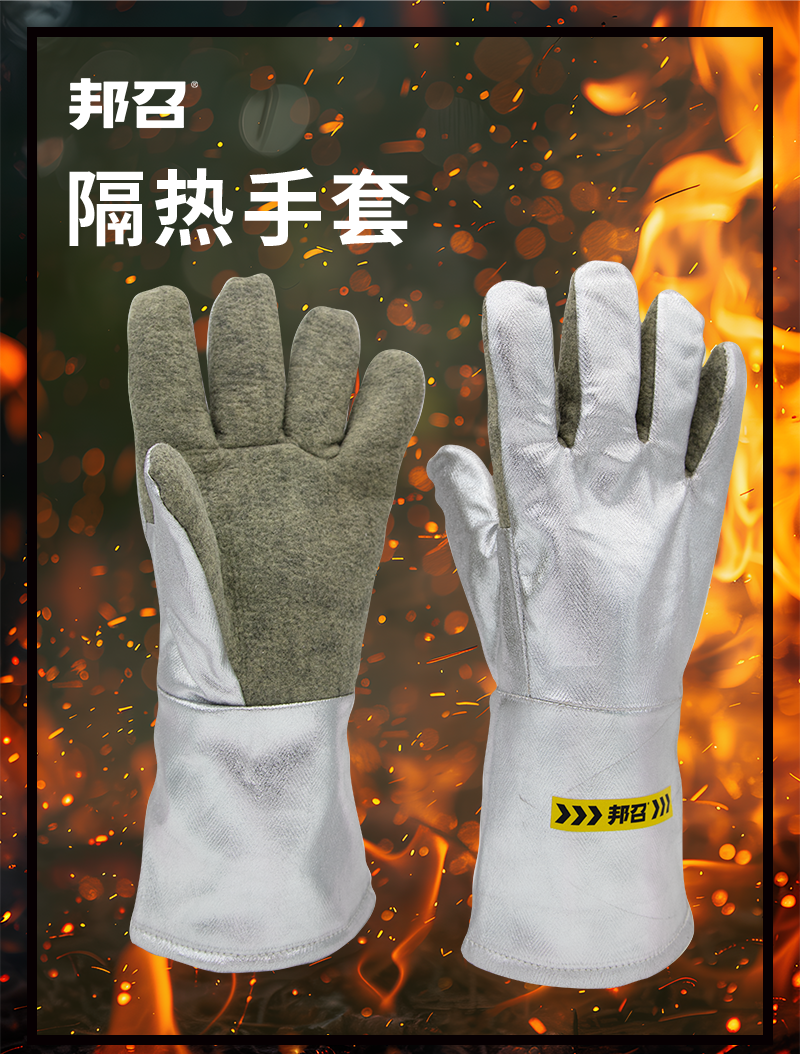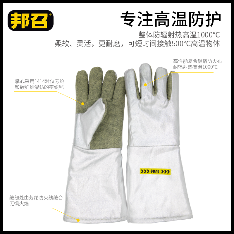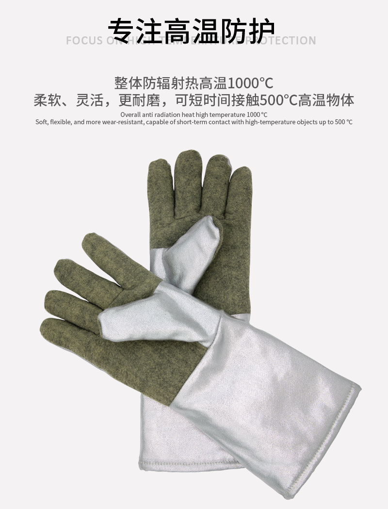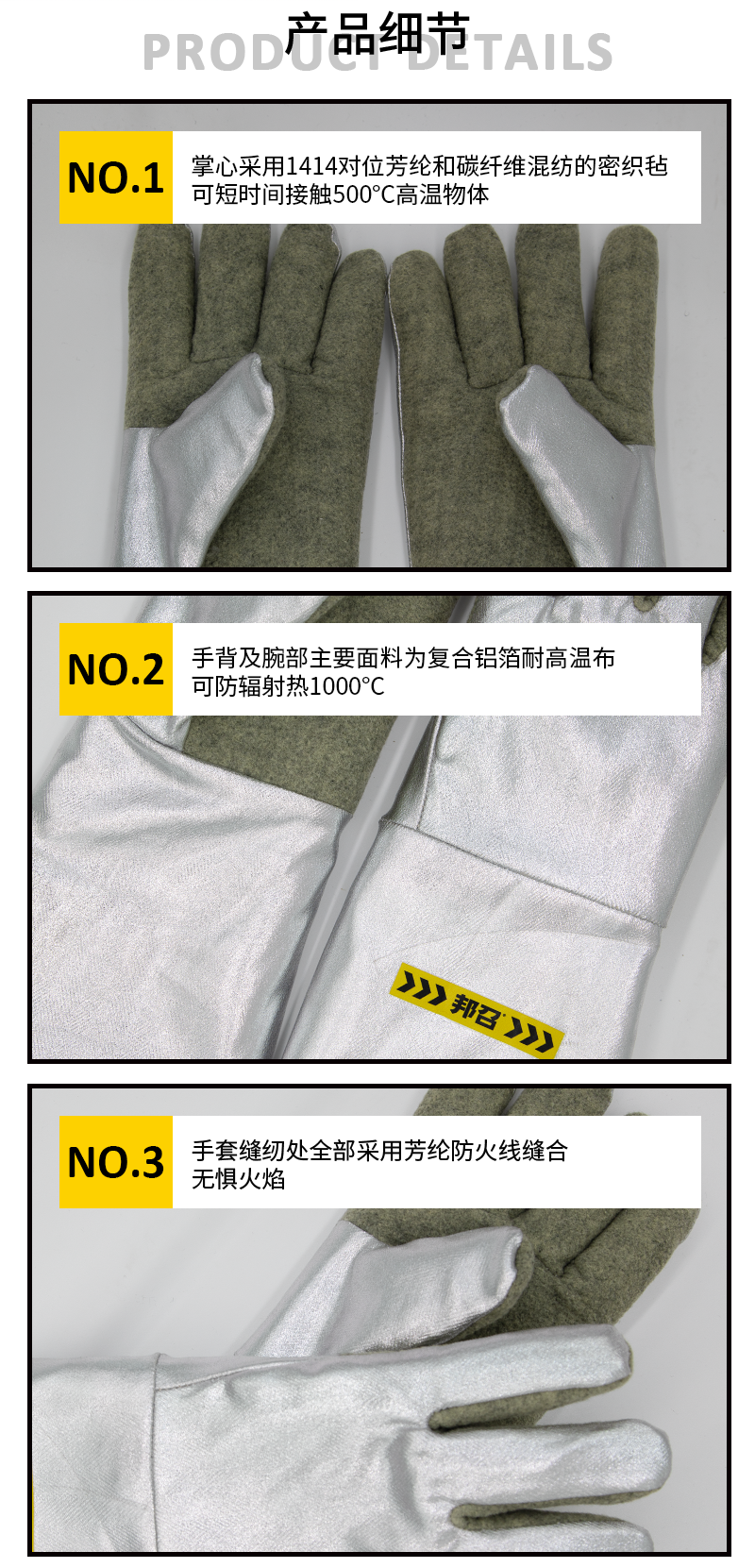 2.耐温:手背及腕部主要面料为复合铝箔耐高温布接触热500°C,防辐射热1000°C;