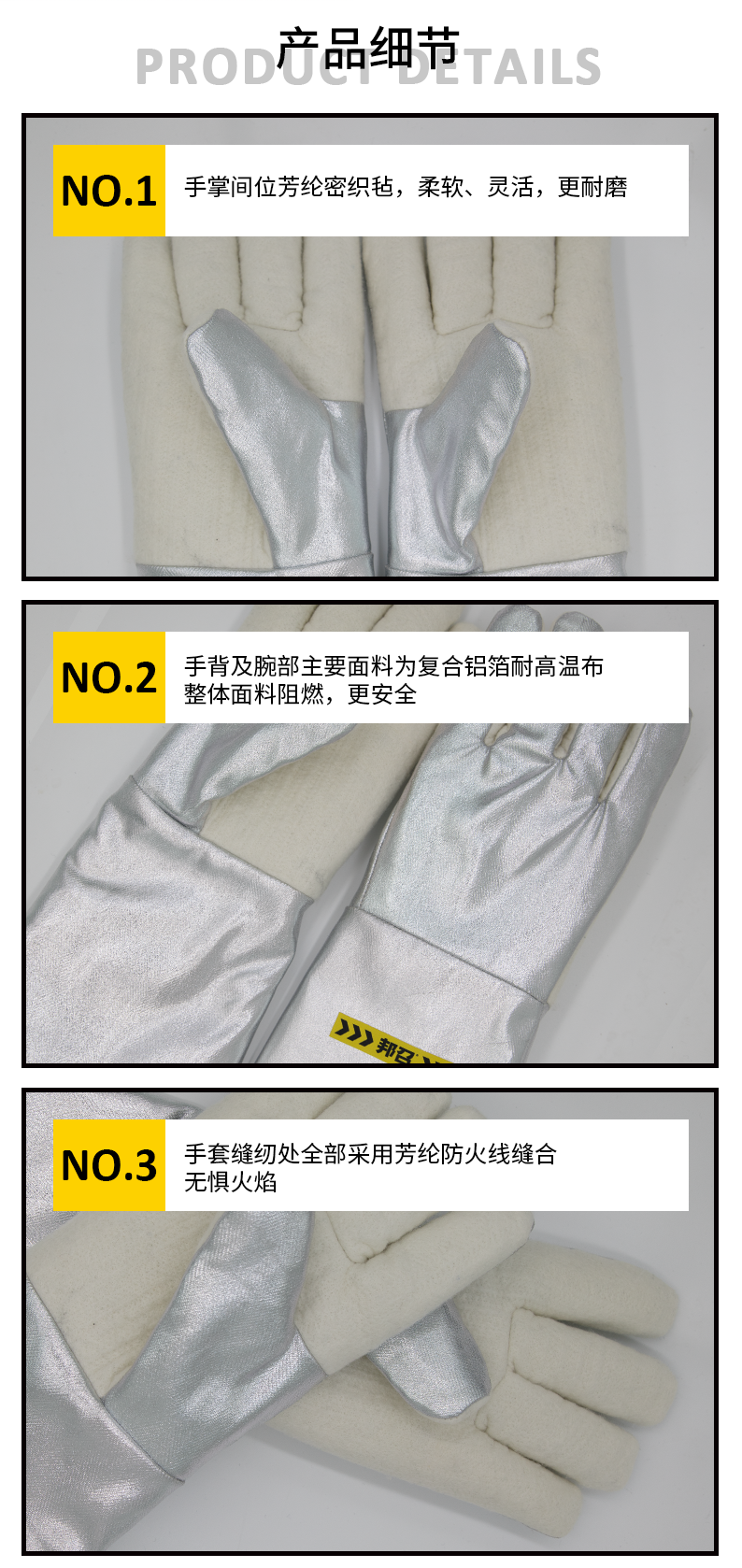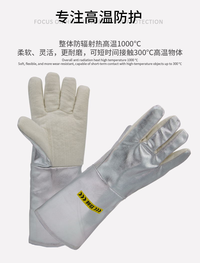 面料:手背及腕部主要面料为复合铝箔耐高温布、手掌为间位芳纶密织毡、缝纫处由芳纶防火线缝合;