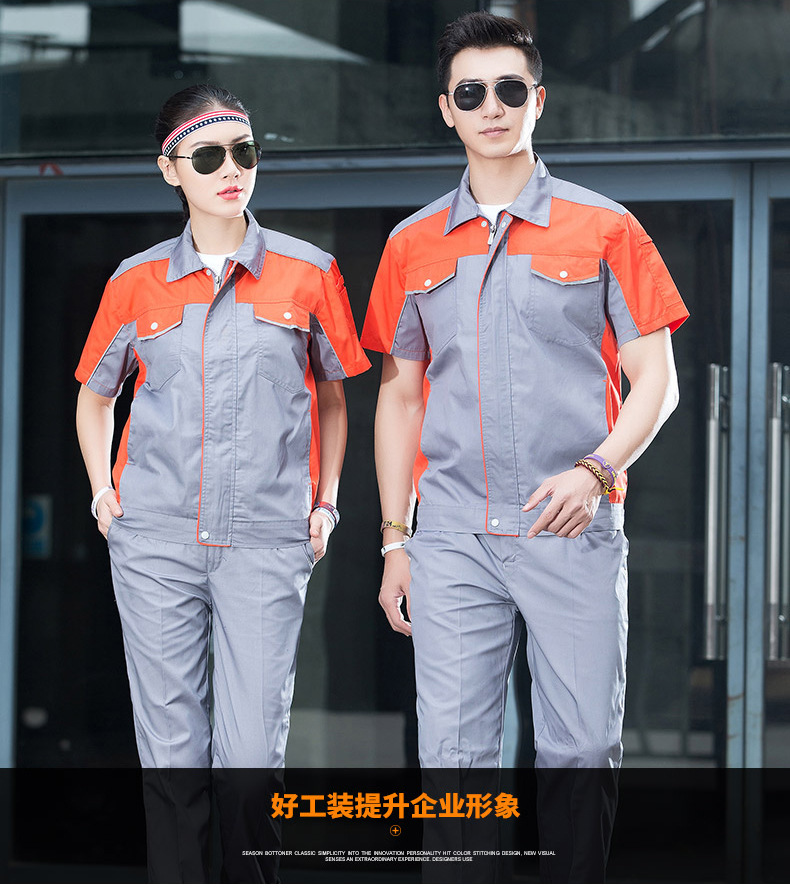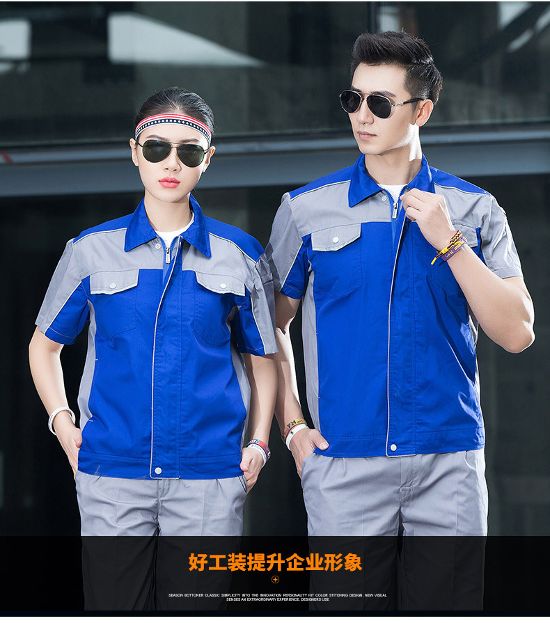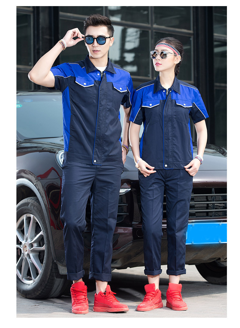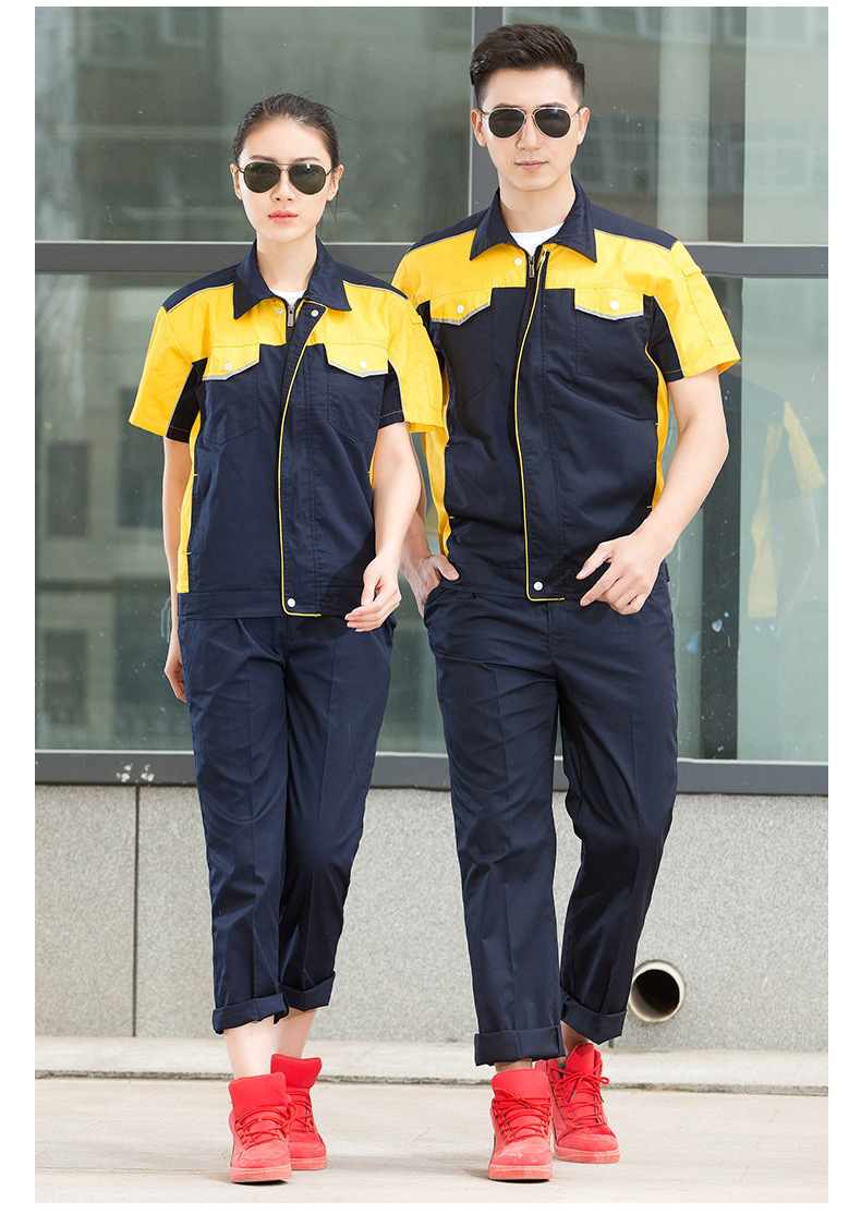 • 商品名称:君御JY-S1502全工艺涤棉细斜纹薄款糖果拼接短袖工作服套装藏蓝配黄色