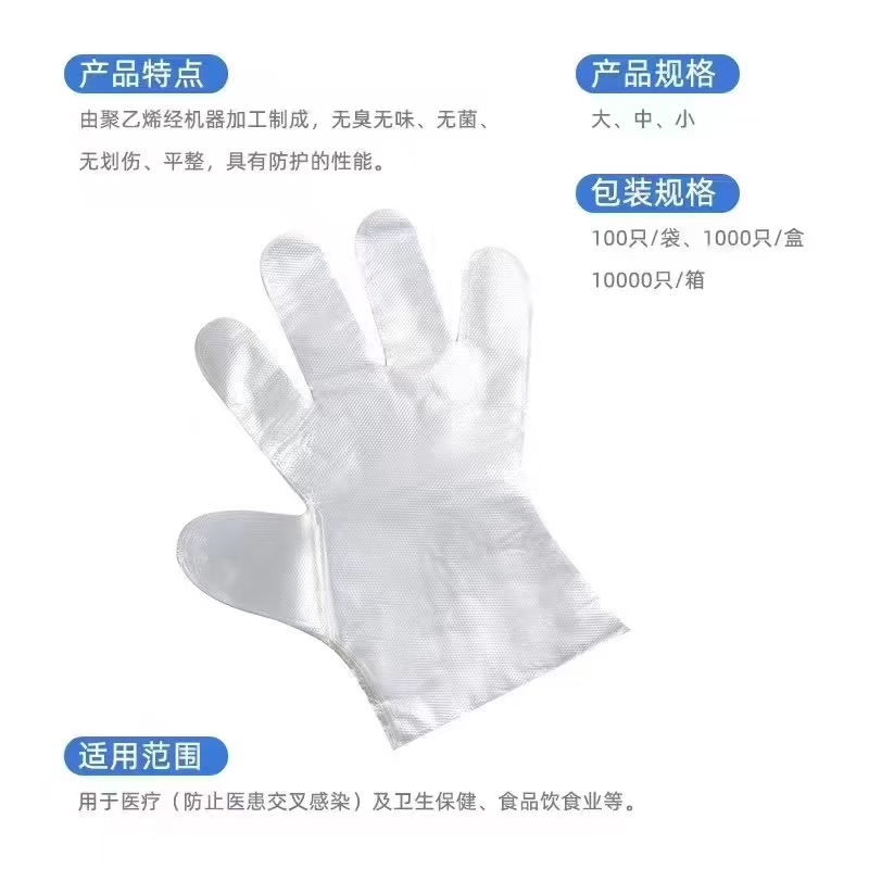 械字号,医用级别,密封性好,避免直接接触,不用担心脏手,,采用优质聚乙烯薄膜制成,无异味,,抗漏性好,抗裂性好,防滑性好。