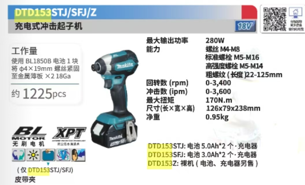• 商品名称:牧田 DTD153 冲击起子机170N.m大扭矩 18V快速充电器 5.0一电一充