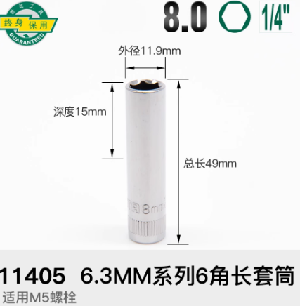 • 商品名称:世达工具 11405 6.3MM系列六角长套筒8MM