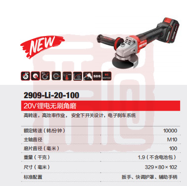 • 商品名称:大有 2909-Li-20-100 20V锂电无刷角磨 100mm下开关单独机头