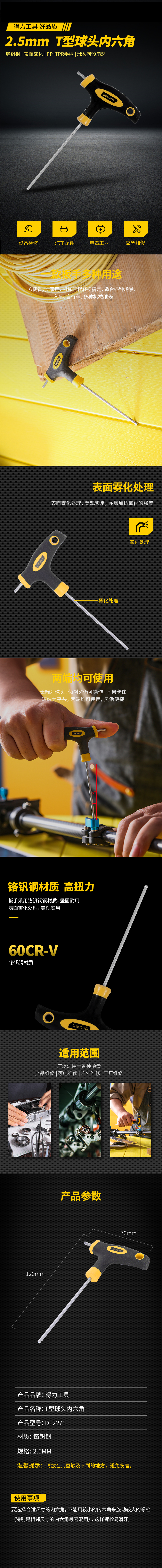 • 商品名称:得力工具 球头T型内六角铬钒钢(黄)