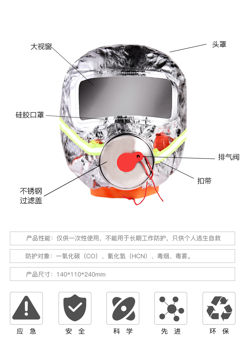 防护对象:一氧化碳、氰化氢、毒烟、毒雾;