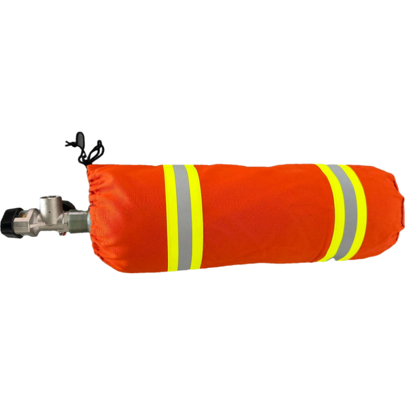 9. 气瓶保护:在气瓶的上端和底部使用半球形橡胶皮套进行保护;对整个气瓶瓶体用芳纶阻燃布料制成保护套(颜色为藏青色或橘红色)进行整体保护,并在保护套上缝制2圈黄银黄反光标识,根据业主需求提供印字服务(字体字号及颜色按灭火战斗服印字标准)。