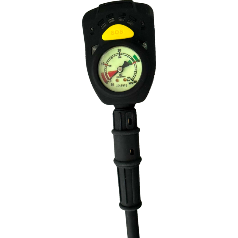 5.7警报器性能:气动警报器内置于压力表管路内,并有橡胶套保护,当气瓶压力下降至(5.5±0.5)MPa时,应发出持续声响警报,连续声响警报至少应以90dB(A)的声强持续15s,,从警报启动至气瓶压力降至1MPa为止;配备智能压力表,具有SOS手动呼救及位移报警功能,侦测人体运动状态,人员停止移动 30 秒后,自动开启声光报警。配备气动警报器,平均耗气量≤1.5L/min。