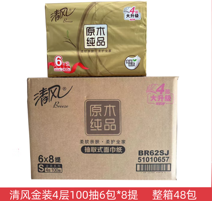 • 商品名称:清风 BR62SJ 原木纯品金装抽纸100抽6包/提