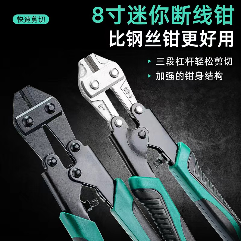 CR-V铬钒钢材质锻压钳头,硬度高,韧性强,刃口锋利,轻松剪切。复位弹簧,开口大小可调,防滑手柄,坚固耐用。