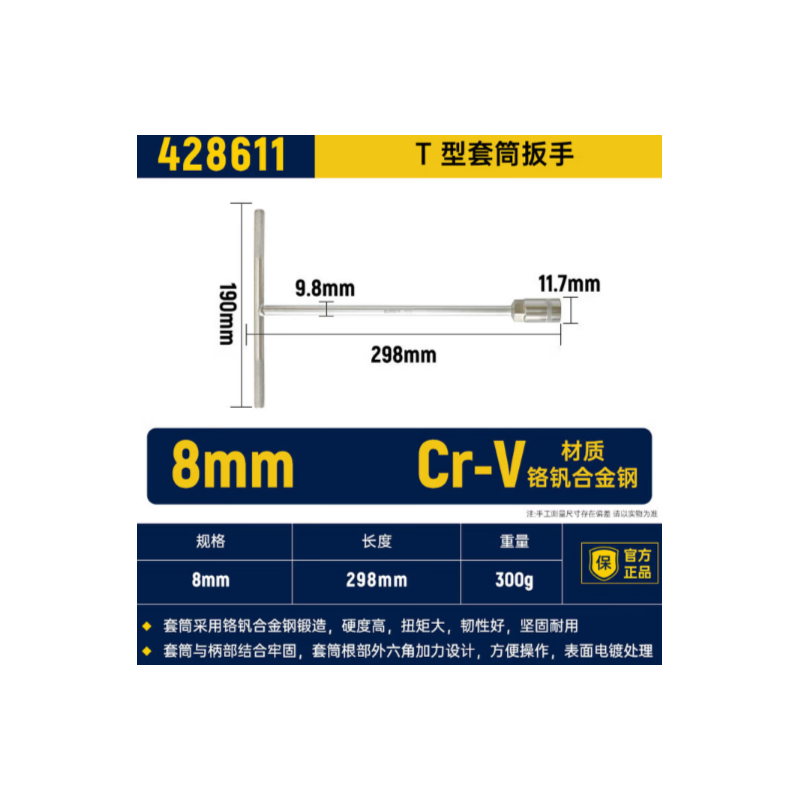 采用优质铬钒钢制造,镜面抛光镀铬防锈处理 ·独特的设计,杆直径10加长杆长300mm ·用于汽车,电动、摩托车维修更适合在狭窄的空间工作 ·把手长度达到200mm施加扭力更大,把手滚花防滑处理