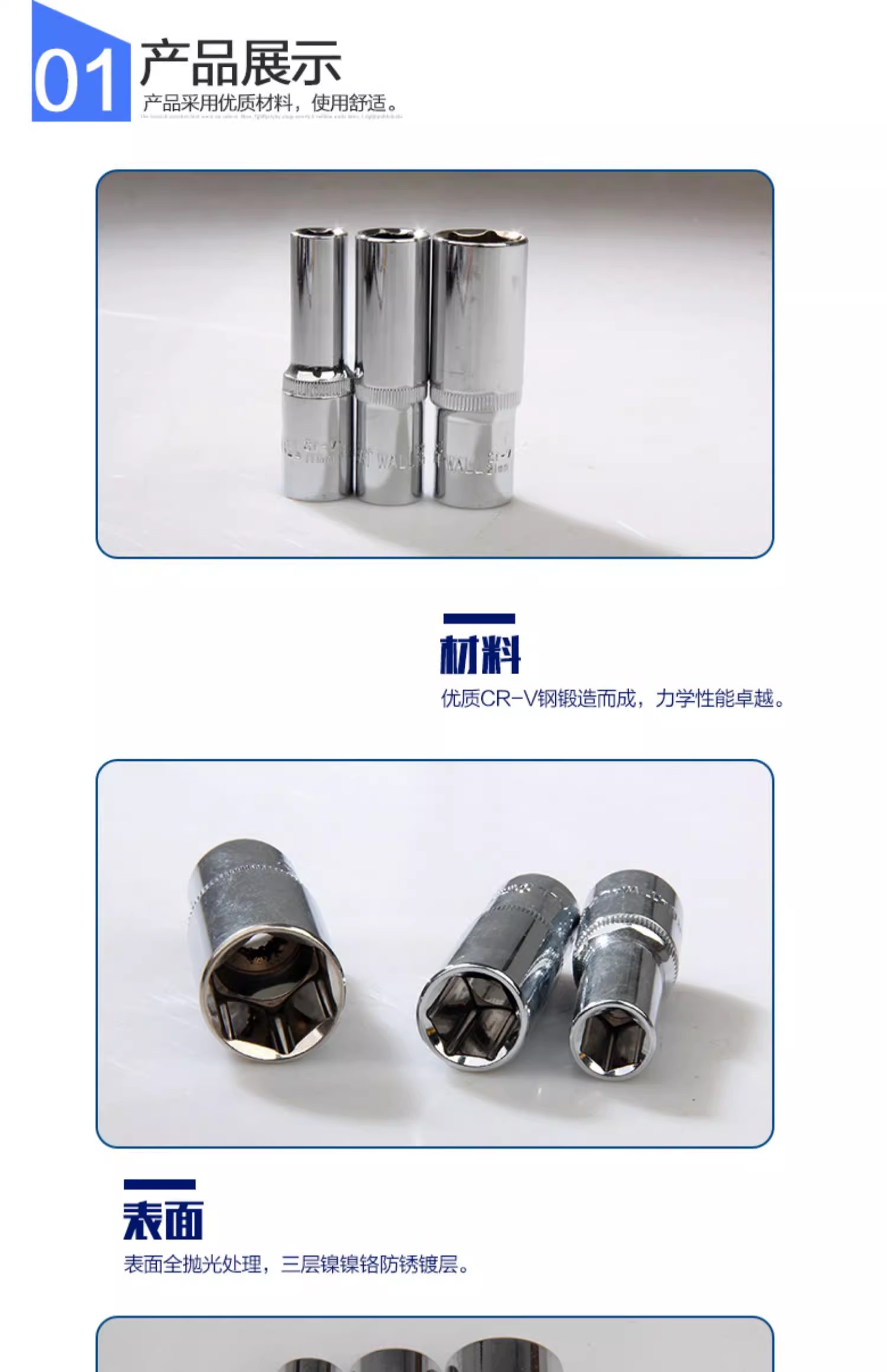 • 优质 Cr-V 钢锻造而成 , 力学性能卓越 • 表面全抛光处理 , 三层镍镍铬防锈镀层 • 建议配合长城精工 1/2" 系列棘轮扳手