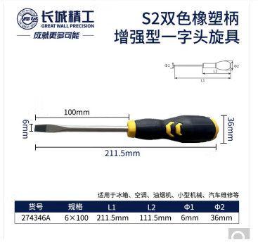 长城精工 274346S2双色橡塑柄增强型旋具一字6*100mm
