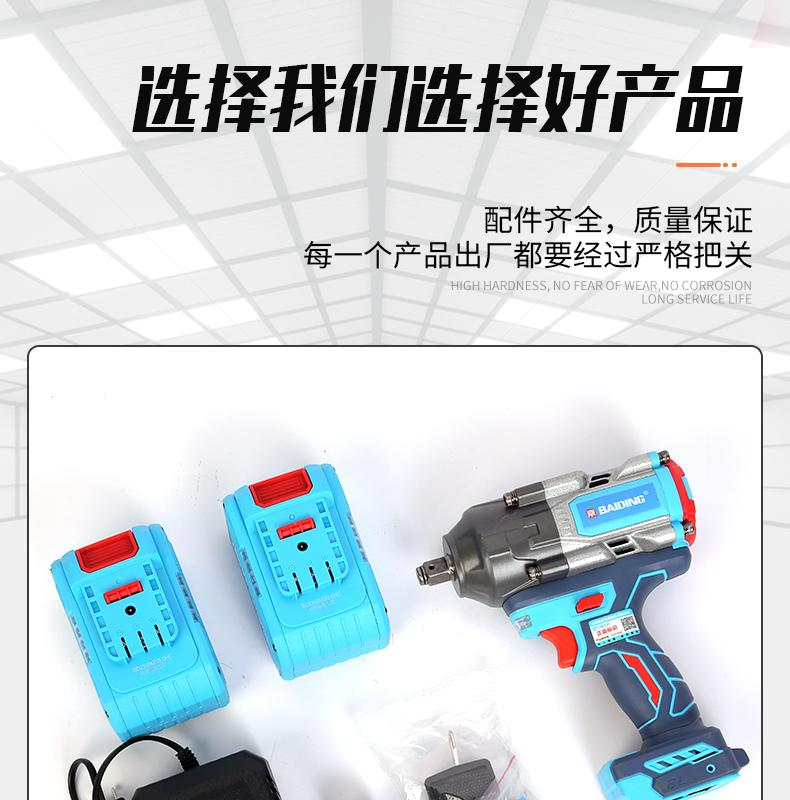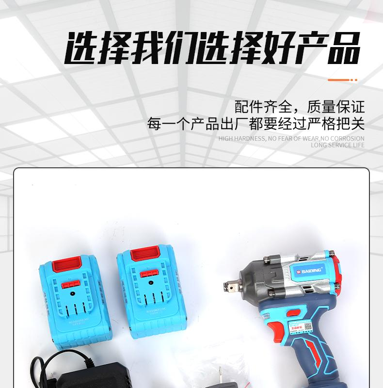 产品特点:LED照明。无极变速开关,正反转一键切换,纯铜电机,全铝机头,无刷电机动力足,大容量电池,快速散热高温过热保护,产品配置:双电铁头,精品彩盒,高档布包,可更换塑盒,适用范围:汽修,安装,工程,市政,电力,铁路等