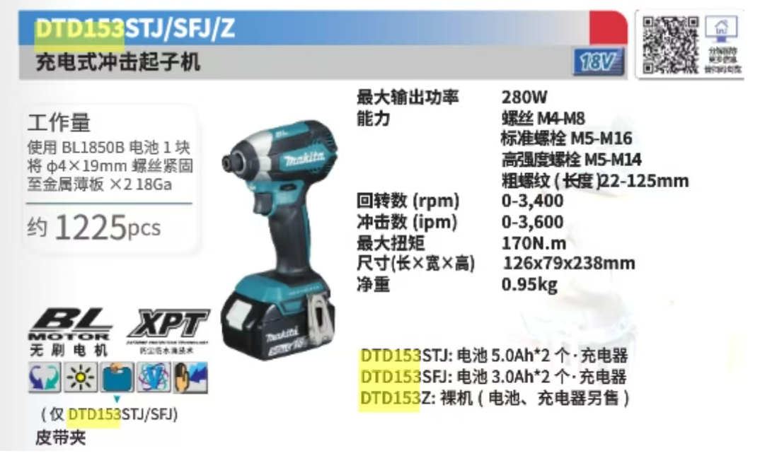 牧田 DTD153 冲击起子机170N.m大扭矩 18V快速充电器 5.0一电一充