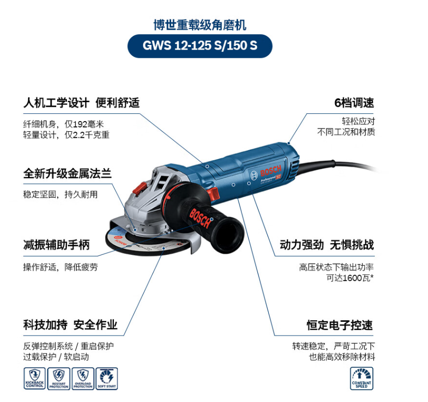 博世(BOSE) GWS 12-125S/S重载级角磨机6档调速切割机打磨机