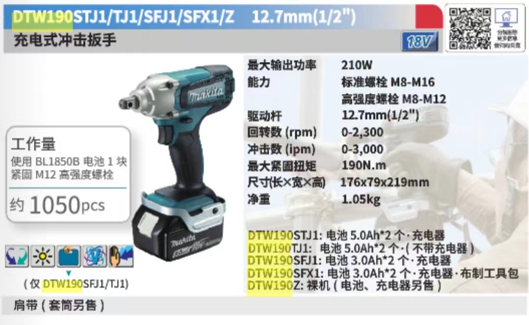 牧田 DTW190STJ 电动扳手 充电式冲击扳手5.0两电一充