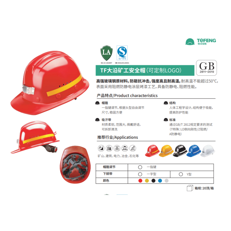 帽壳材质:玻璃钢 下颏带:D型 帽衬:一指键 颜色:红色 帽壳外形:圆顶 供应配件:帽衬 吸汗带:针织布 透气孔:有 两侧插槽:无 国标GB 2811-2019