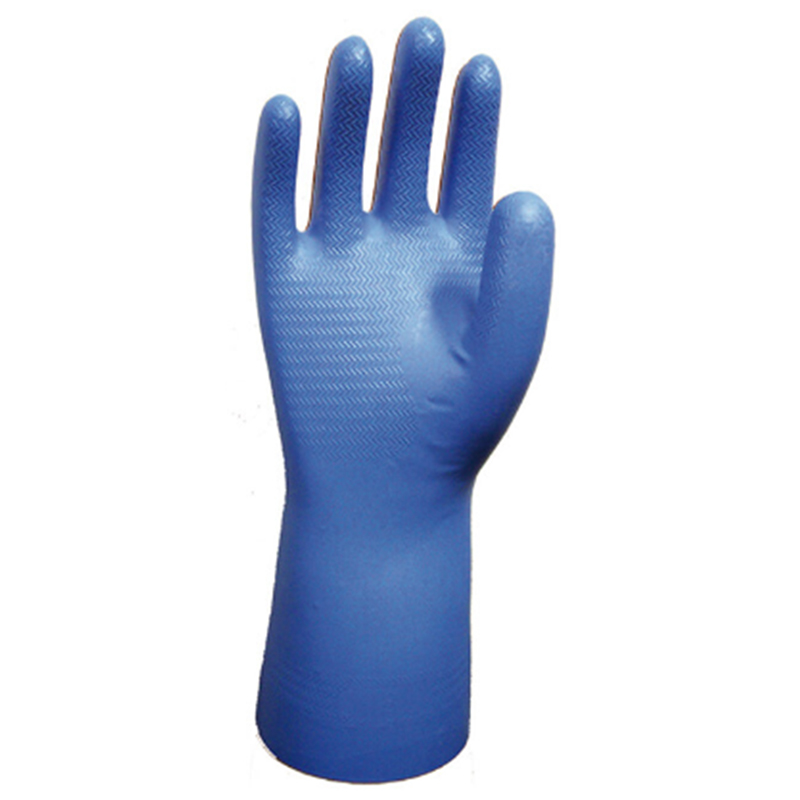 尺寸:7 式样:全浸塑 涂层材料:丁腈 袖口:长手套 颜色:蓝色 310mm 0.2mm 防割等级:2级 防刺穿等级:1级 防静电:是 防化|防静电 EN388|EN374