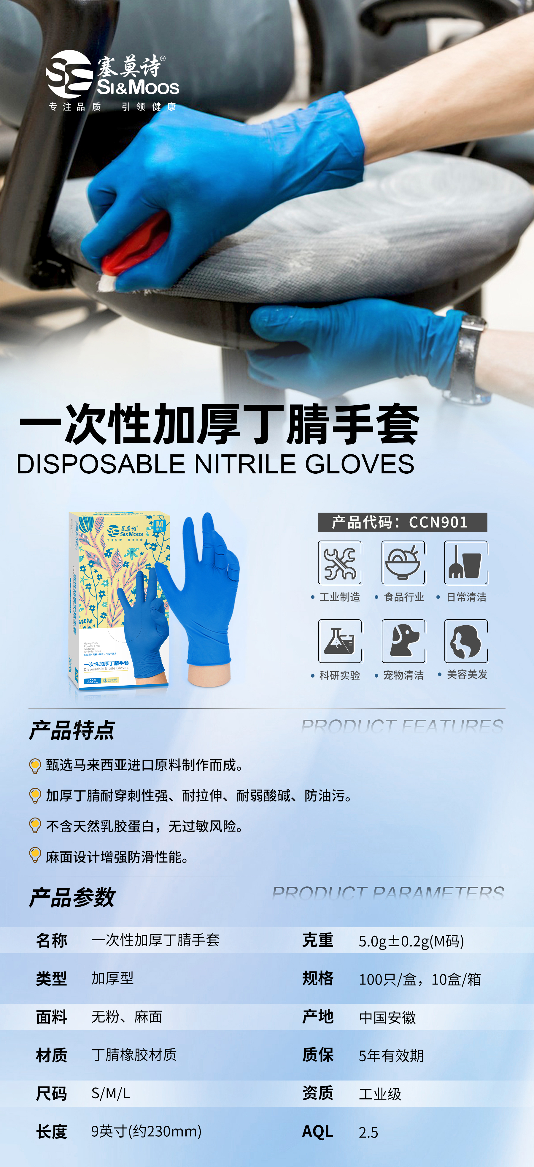 塞莫诗 CCN901 一次性加厚丁腈手套