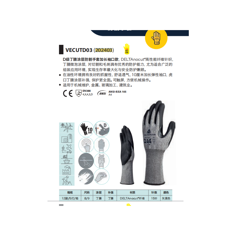 代尔塔 202403 D级丁腈半涂层15针加长防割手套