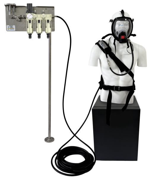 (需定制)低压供气装置是通过法兰连接气源,气体通过管路经过油水分离器三联件(滤尘、滤水、滤油;自动排水)过滤,然后通过中压管路到达背压阀(固定在背负装置上),并通过连接短管进入供气阀,最后进入正压式全面罩内,供作业人员呼吸。