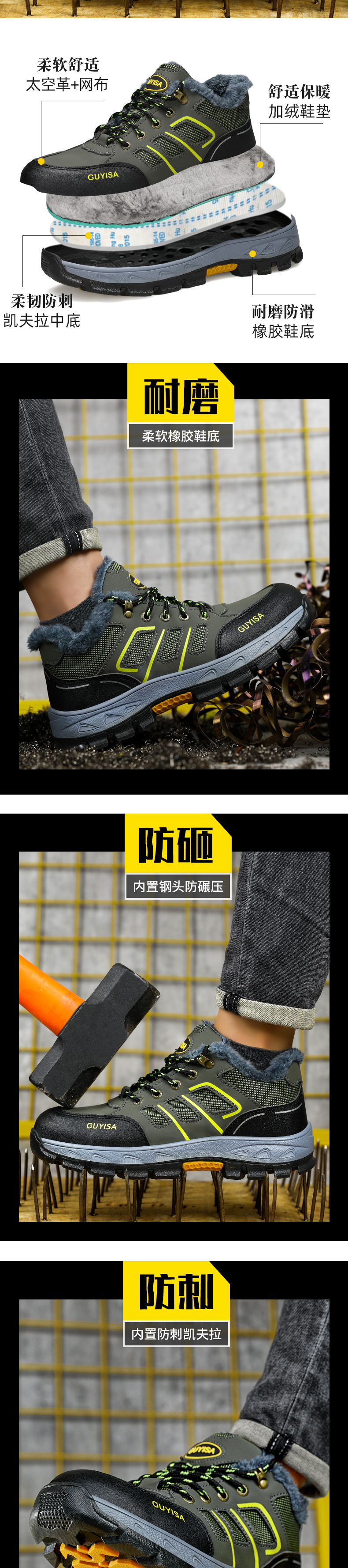 凯夫拉中底,柔韧防刺,钢头防砸防撞防压;