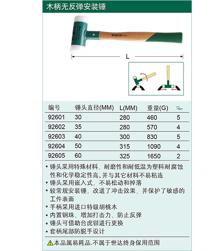 世达 92604胡桃木柄无反弹安装锤50mm。