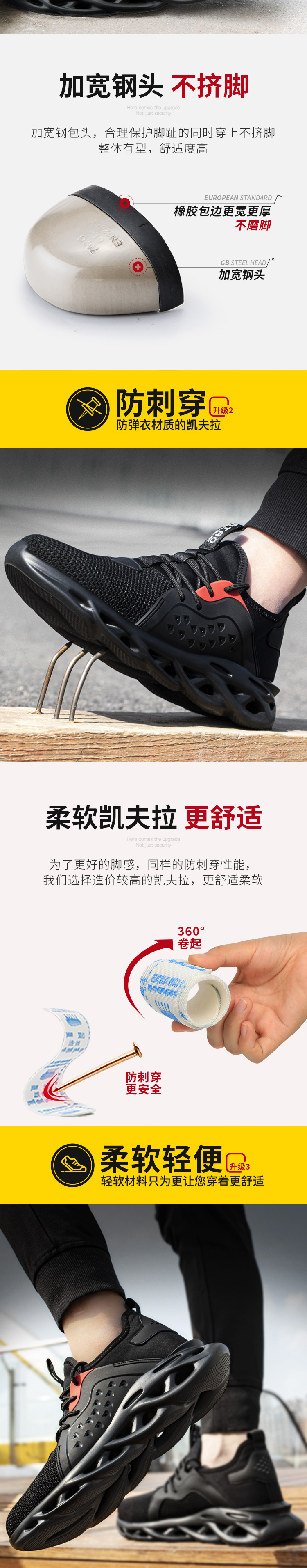 加宽钢头,合理保护足趾的同时穿上不挤脚;