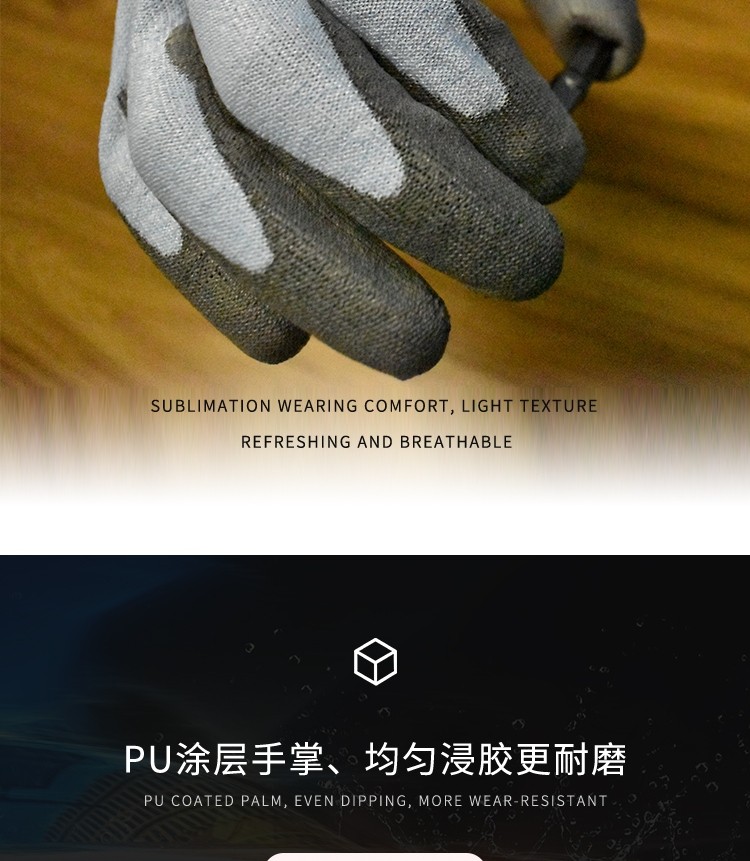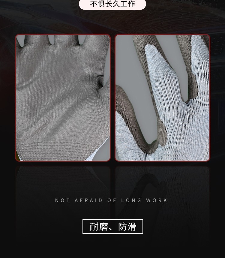全掌PU浸胶防滑,保持良好的抓握力,增加耐磨性,延长手套更换周期;