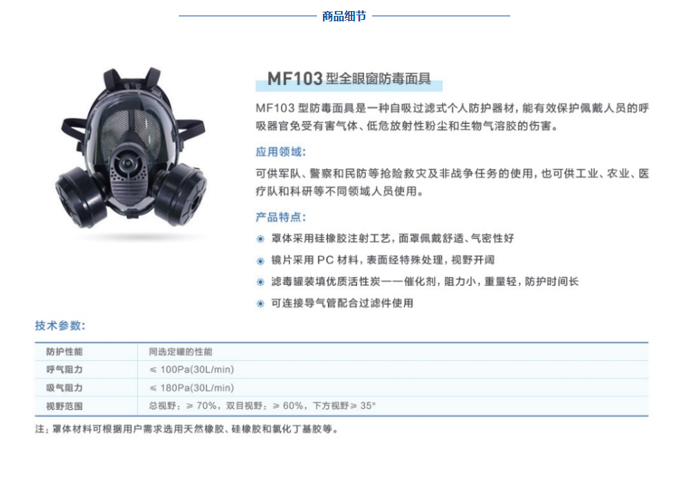 MF103型防毒面具是一种自吸过滤式个人防护器材,能有效保护佩戴人员的呼吸器官免受有害气体、低危放射性粉尘和生物气溶胶的伤害。