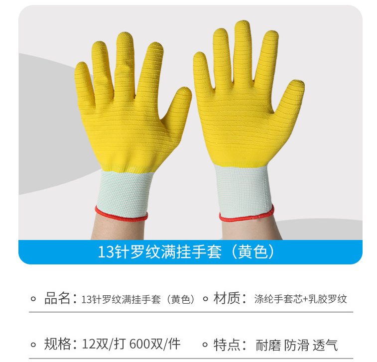 • 商品名称:康利 13针罗纹满挂手套仓库搬运耐磨防滑挂胶浸胶工地干活防护手套