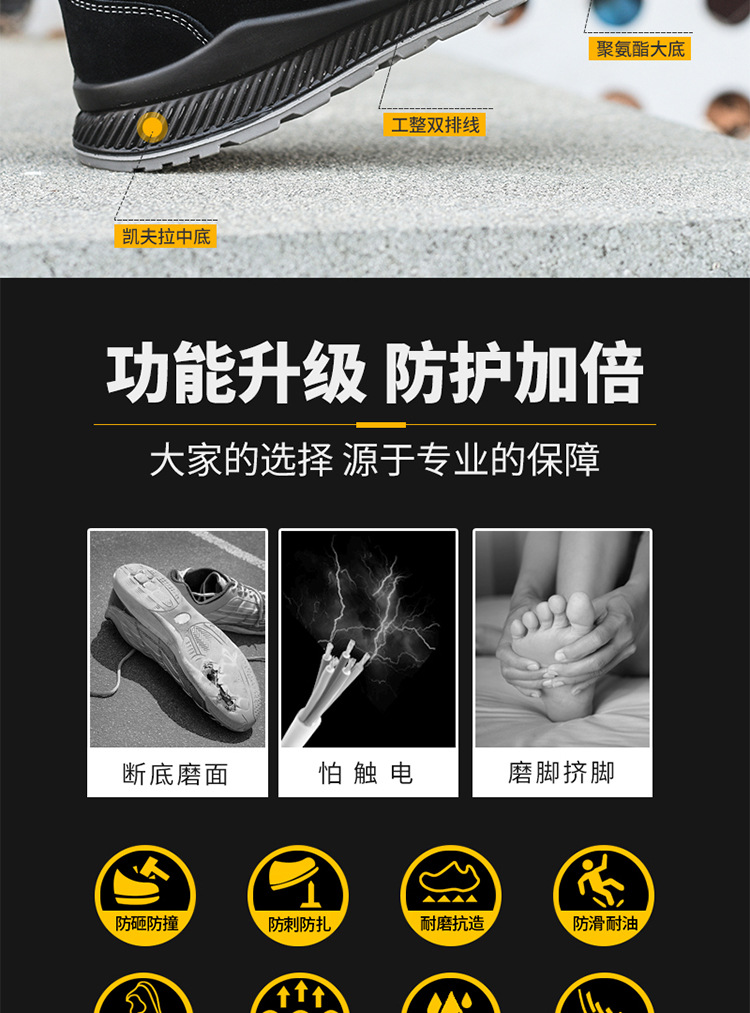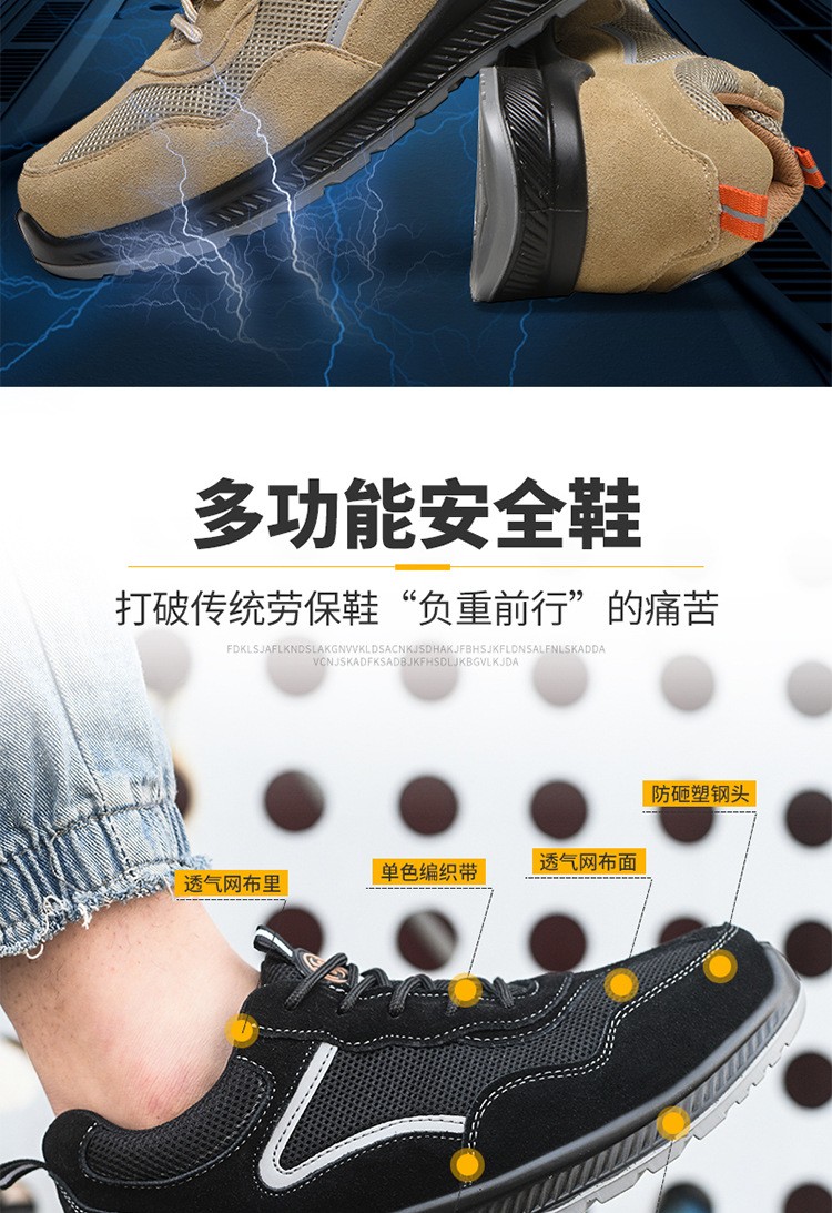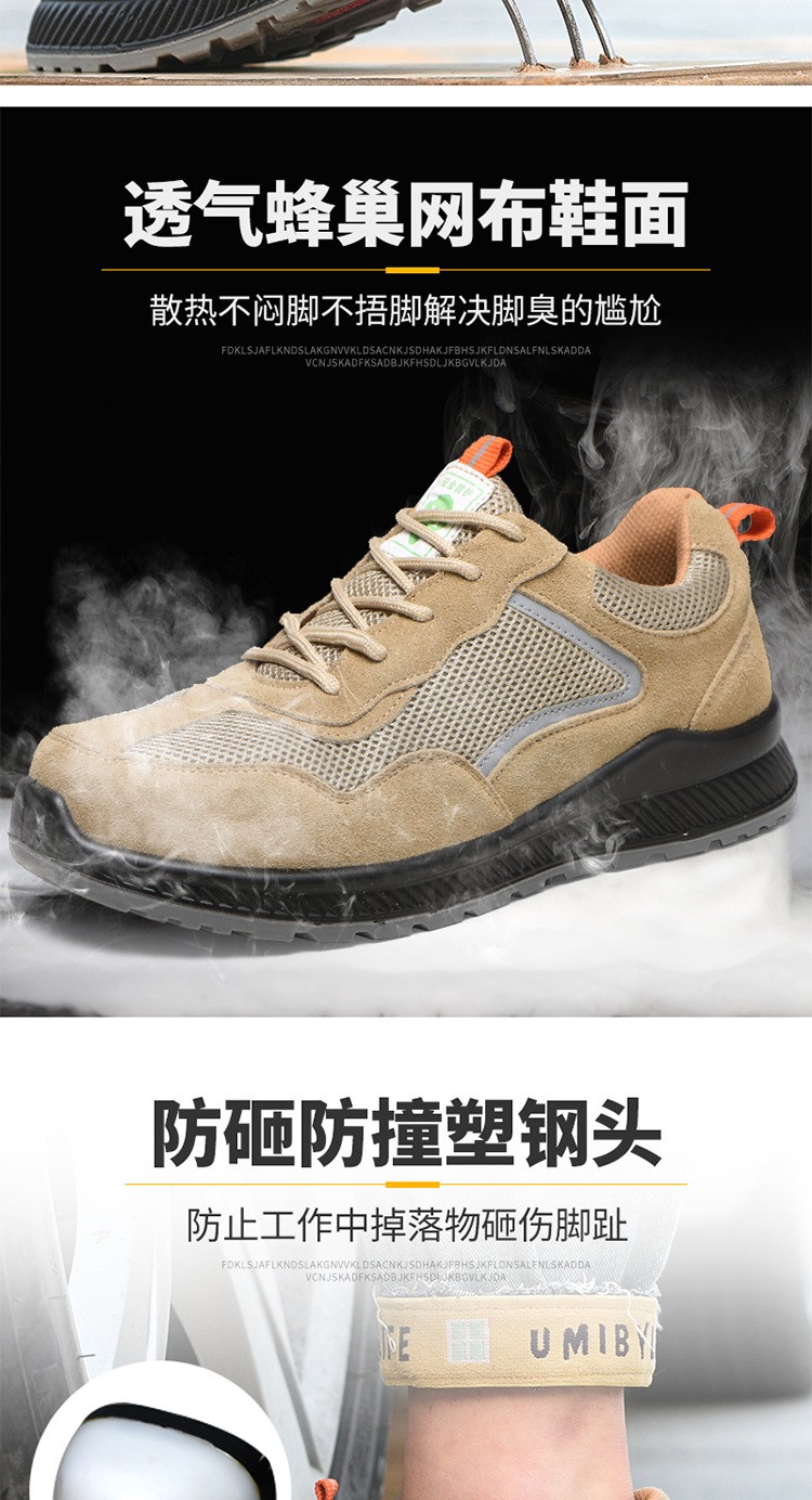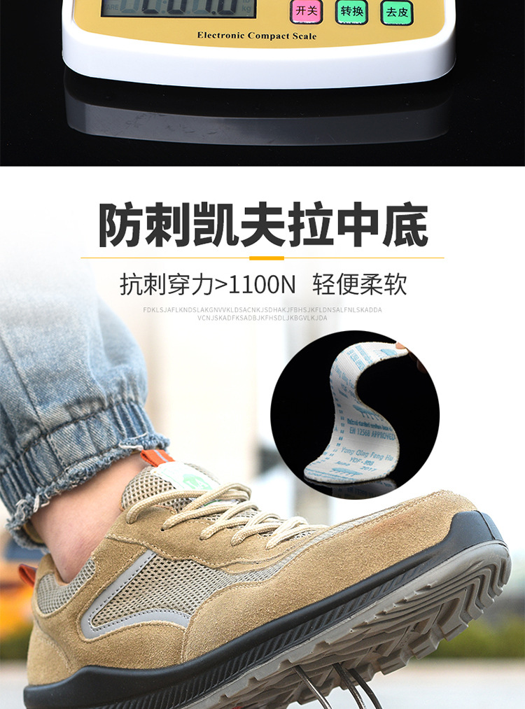 透气网布,防砸塑包头,凯夫拉中底,聚氨酯大底。
