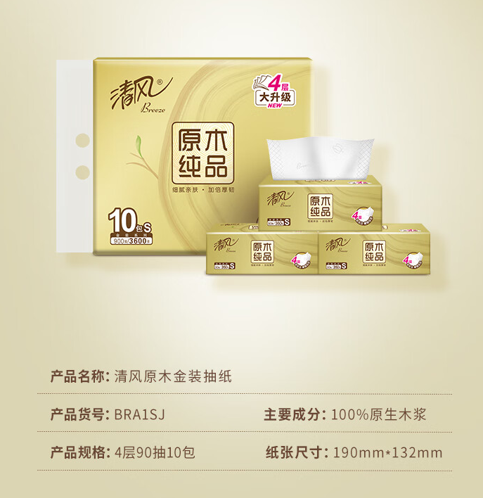 • 商品名称:清风 BRA1SJ1 抽纸4层90抽10包190mm*132mm