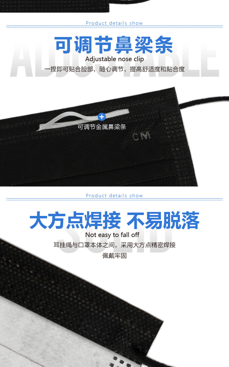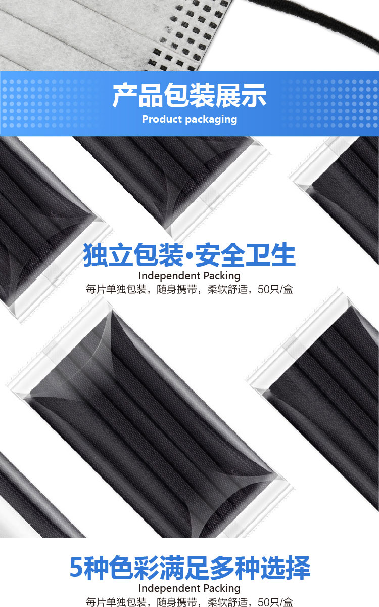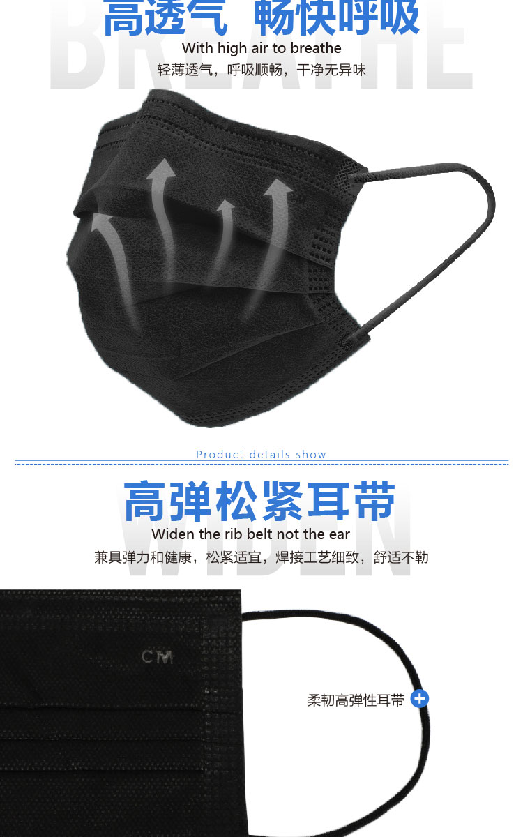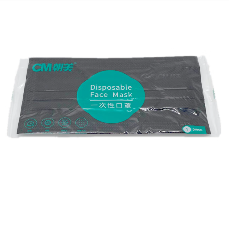朝美7002 一次性三层平面口罩 耳戴式 黑色。