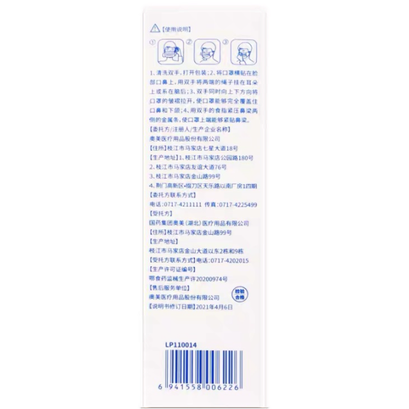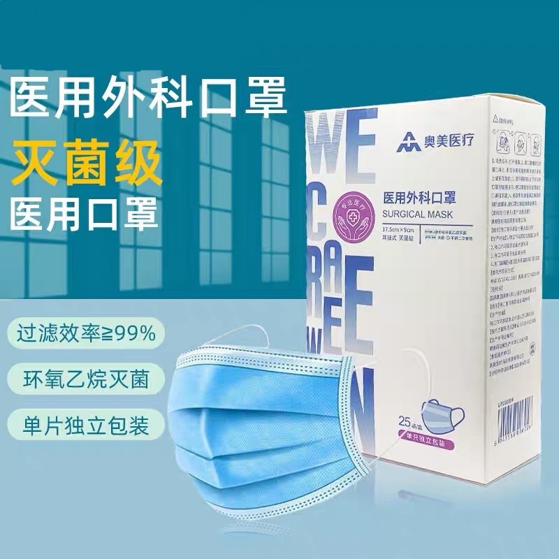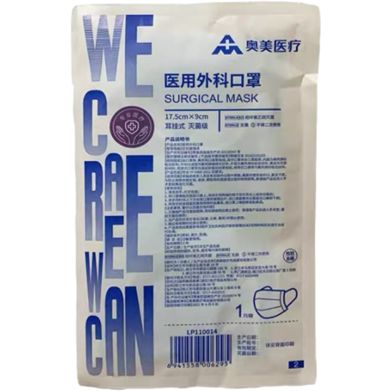 奥美医疗 LP110014 医用外科口罩 17.5cm×9cm 耳挂式 蓝色。