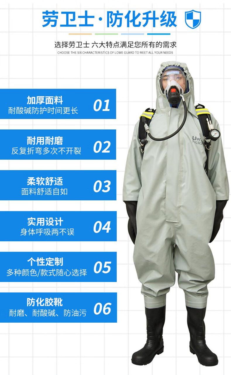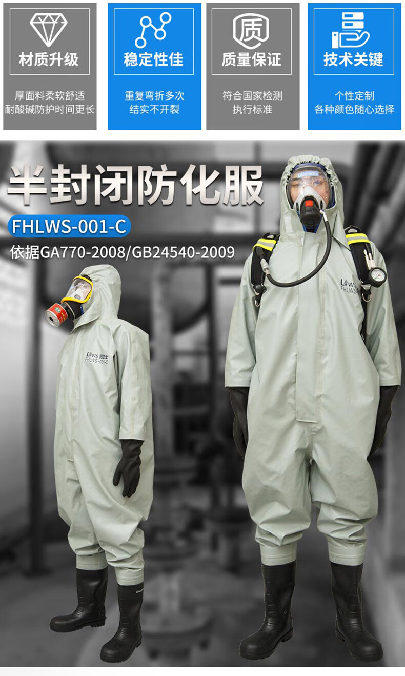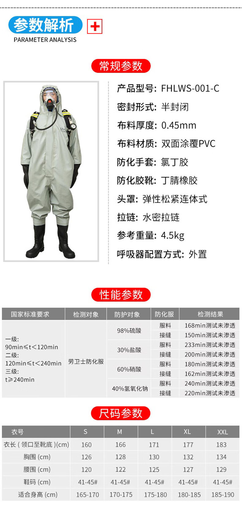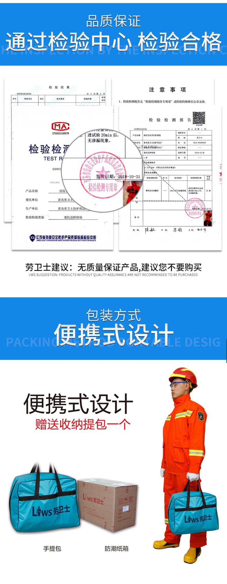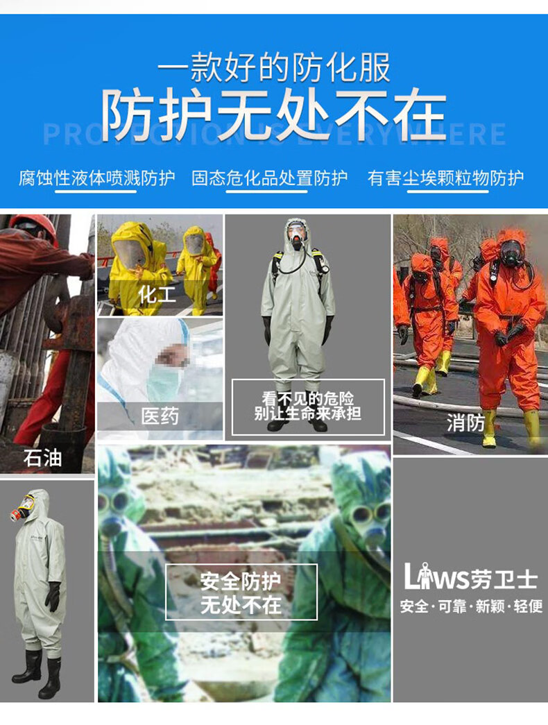 用途:适用于消防队员 工作人员在有酸碱 汽油等化学品事故现场穿着的防护服装。