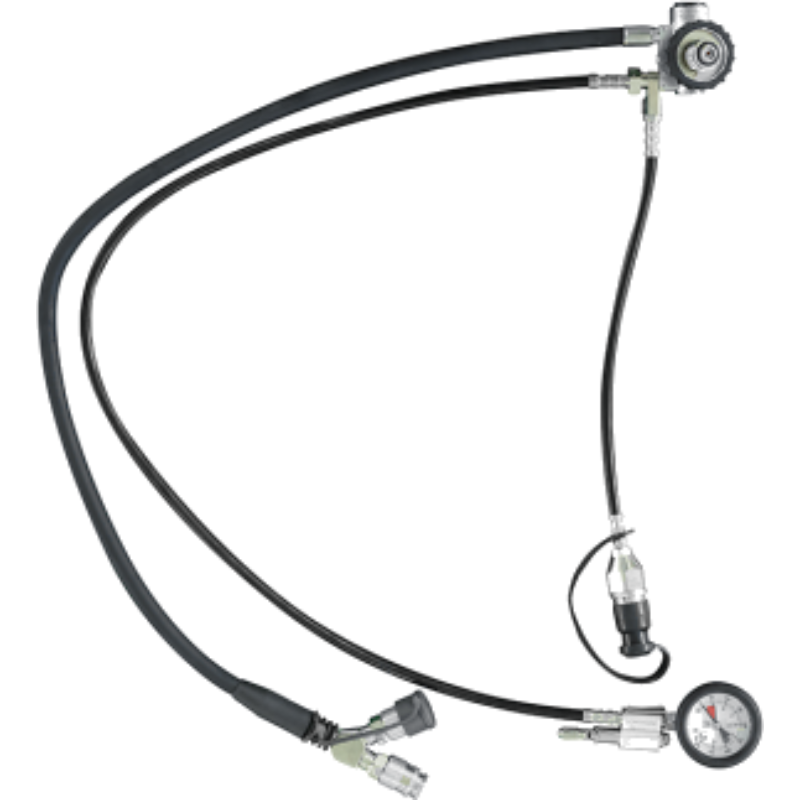 减压总成(快充款)主要由减压器、安全阀、中压管、高压管、报警装置、快速接头、快速充气装置、压力表八部分组成。