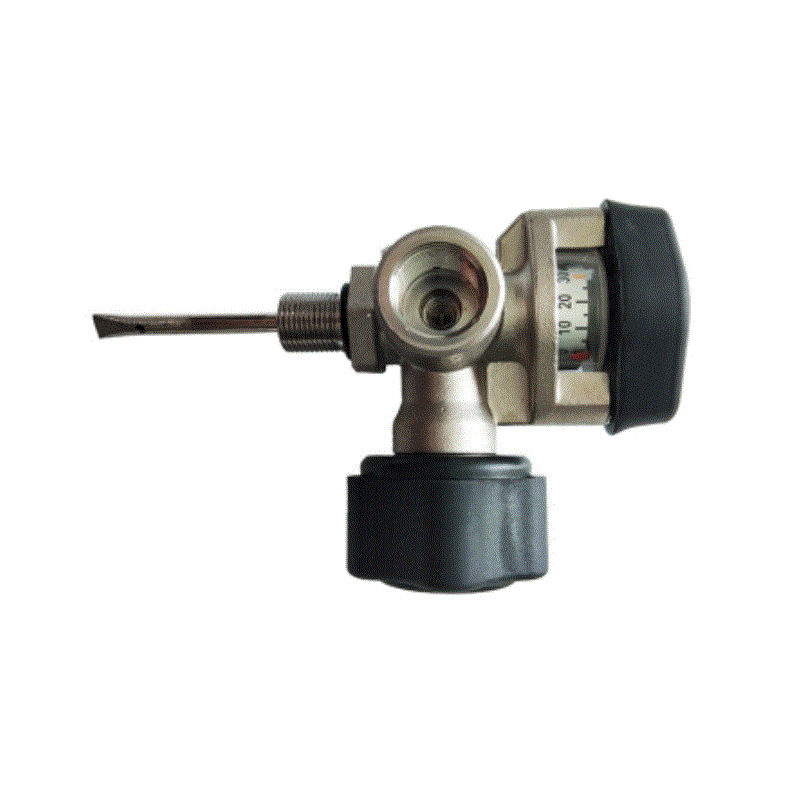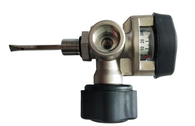 右手式自锁双面带表瓶阀:气瓶瓶阀的开启方向为逆时针,气瓶瓶阀在开启后能保证不会被无意关闭,而气瓶瓶阀开启须旋转两周,可避免因使用过程中不慎碰撞或误操作而关闭气瓶阀,气瓶瓶阀关闭时需按压手轮,气瓶瓶阀上设有安全膜片,爆破压力为(37-45)MPa,可防止气瓶因内部压力过高而变形或爆破。