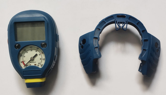 压力平视显示装置:简称HUD,其安装在全面罩内,能够将智能压力表显示的空呼气瓶压力、剩余气量、使用时间等数据通过蓝牙发射到HUD压力平视装置上进行灯光提示,有效避免因低头查看压力表,影响注意力而耽误救援时间。