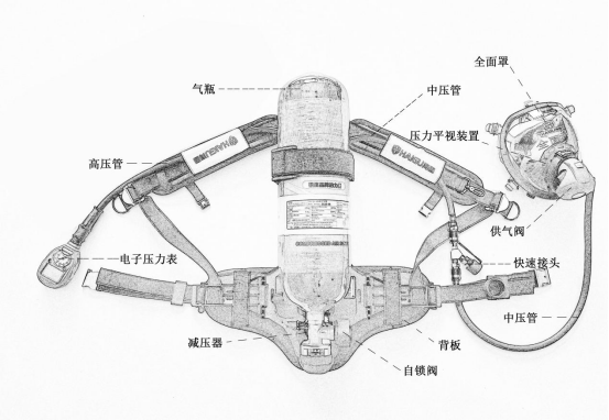 正压式消防空气呼吸器是利用压缩空气供人呼吸的自给开路式正压空气呼吸器。工作人员从肺部呼出的气体通过全面罩上的呼气阀排入大气中,当工作人员吸气时,有适量的新鲜空气由气瓶经气瓶开关、减压器、中压导气管组、供气阀、全面罩将气体吸入肺部,完成了整个呼吸循环过程。在这一个呼吸循环过程中,由于全面罩内的呼气阀及供气阀的进气阀都是单方向开启,气流方向始终沿着一个方向前进,构成整个的呼吸循环过程。