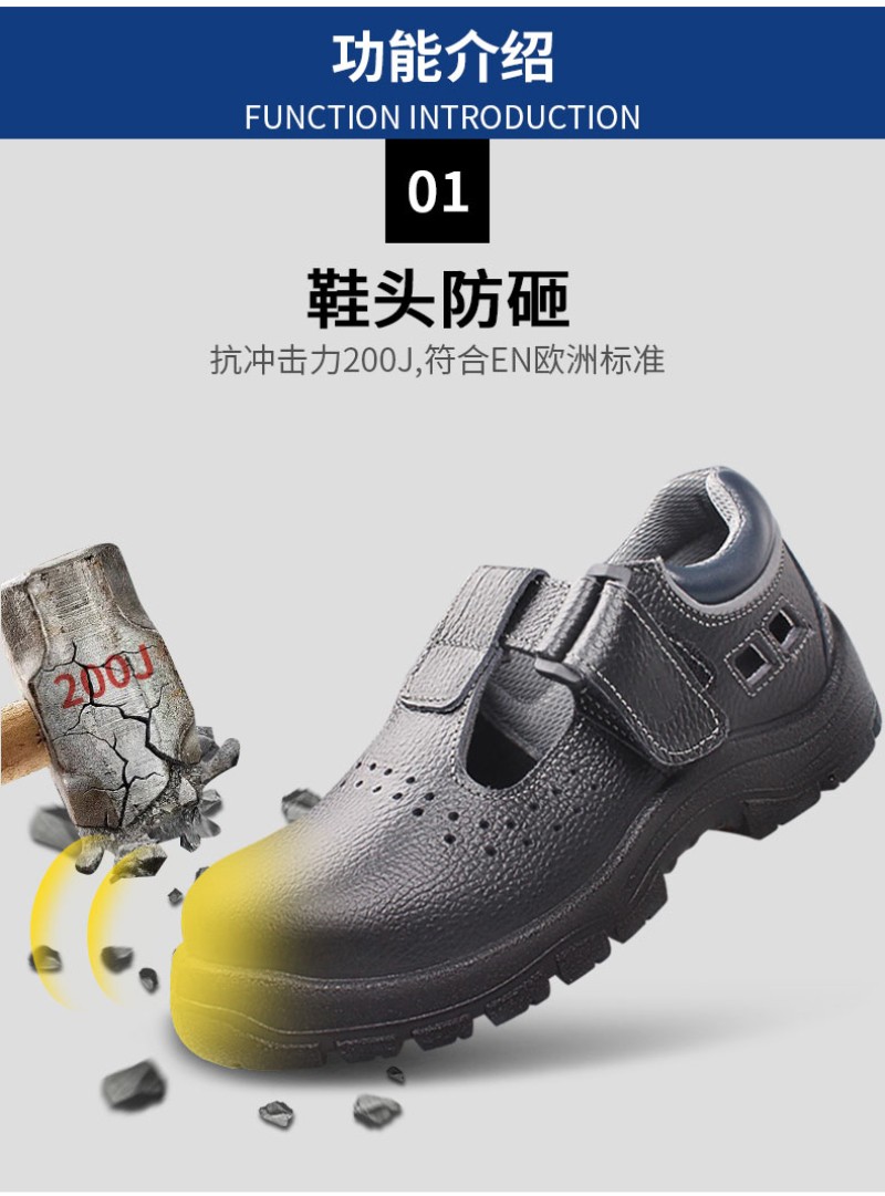 鞋头防砸,抗冲击200J,符合EN欧洲标准;