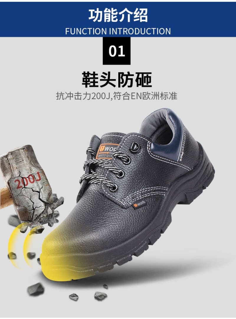 鞋头防砸,抗冲击200J,符合EN欧洲标准;