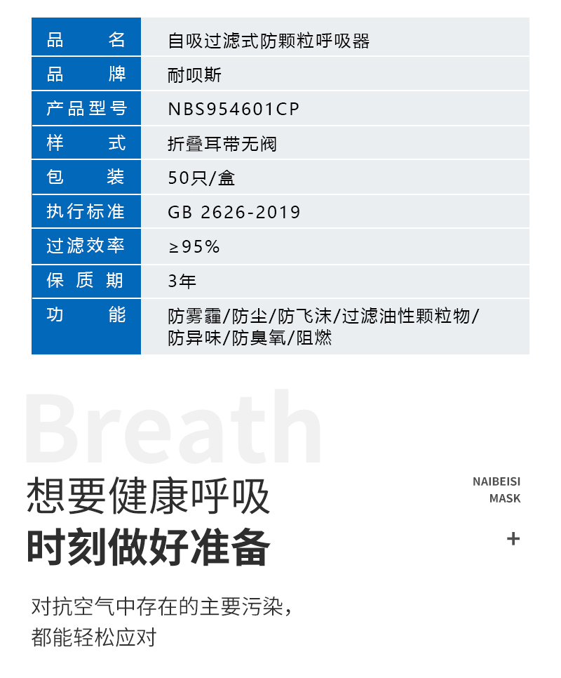 耐呗斯NBS954601CP折叠耳带无阀焊接口罩(舒适款);