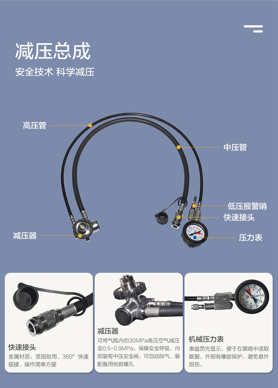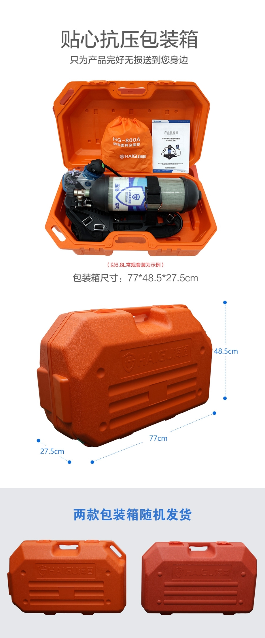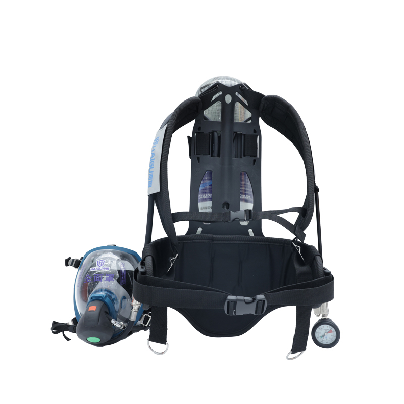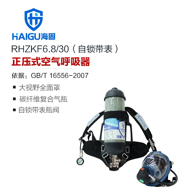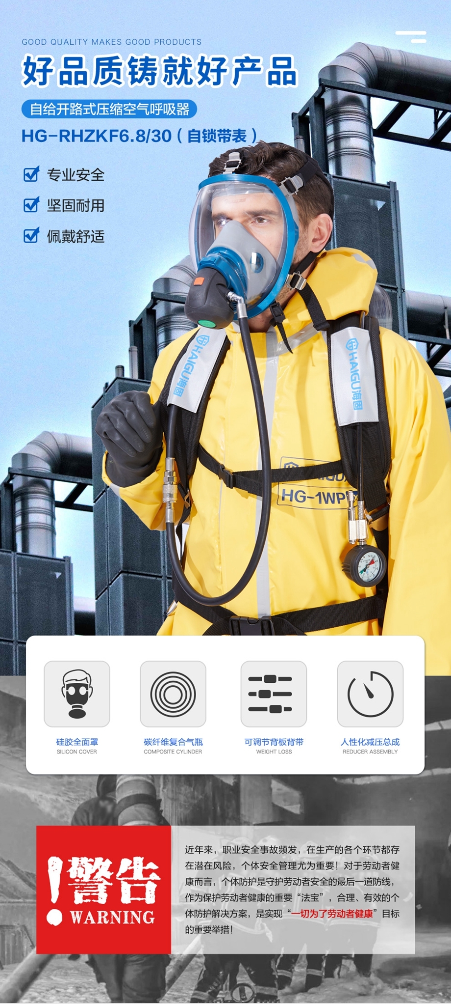 HG-RHZKF6.8/30(自锁带表)自给开路式压缩空气呼吸器,(以下简称空气呼吸器)是一种正压式呼吸保护装置。它配备有视野广阔、明亮、与面部贴合良好、气密的全面罩。使用过程中,全面罩内的压力始终大于周围的大气压力,因此佩戴本空气呼吸器安全可靠;