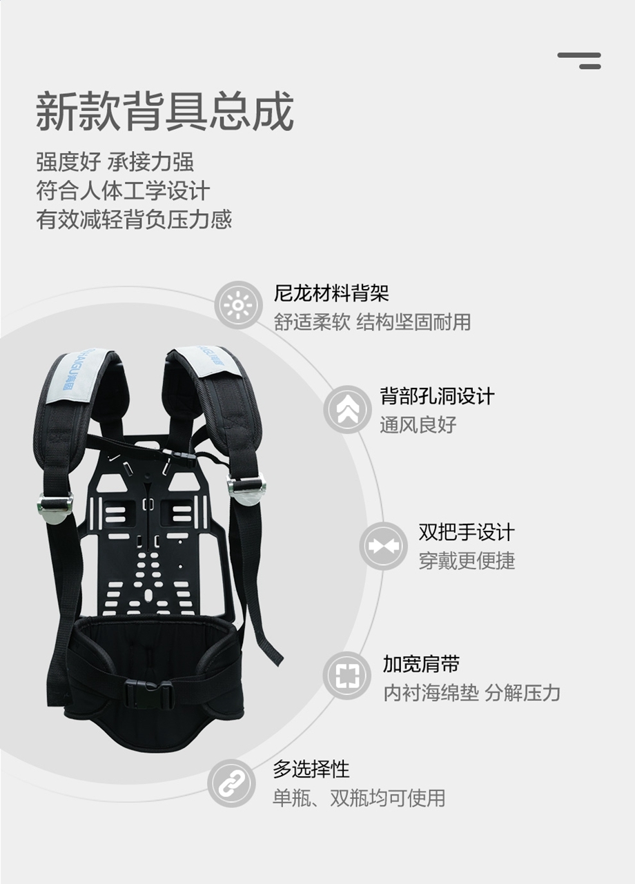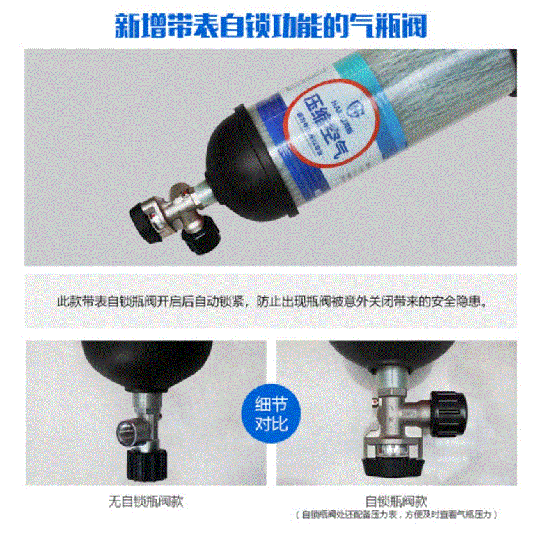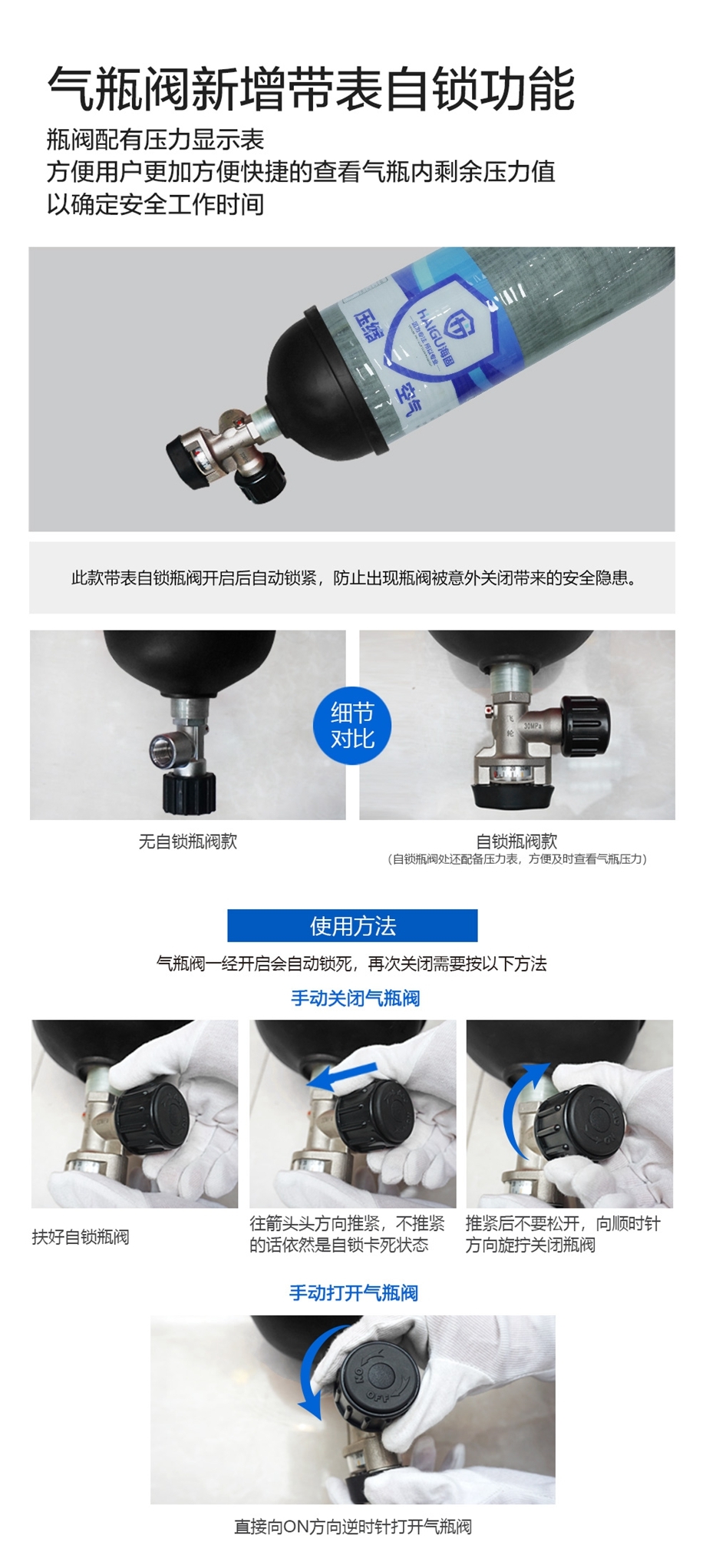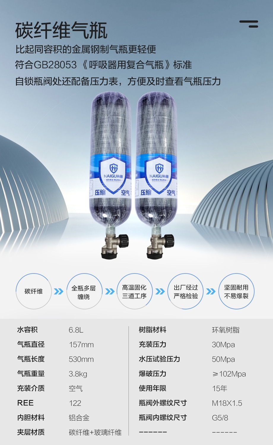 气瓶采用四层复合结构设计,瓶身材质由内到外依次为:铝内胆-碳纤维-玻璃纤维-环氧树脂 ;气瓶质轻坚固,不易爆裂,配有高压防护装置甁阀,避免瓶内压力过高引起气瓶爆裂。
